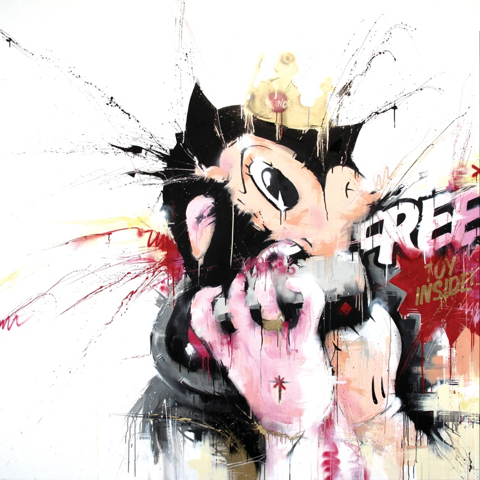 The thirteen artists in “Urban Myth’ make their mark wherever possible, creating atmospheric artspaces united by unique visual languages, quirky characters and colorful, dynamic compositions. Using any combination of stencil and freehand painting to create images, these urban artists have been pushing the role of the artist as social commentator and encouraging reconsiderations of art and society for the past twenty years. Graffiti artist Chu creates large-scale works which encourage the viewer to see the world as your studio. Steff Plaetz is one of the original three Scrawl Collective members Plaetz’s instantly recognizable works are among the first generation to pioneer the use of rough sketchbook drawings in finished pieces of art. Pure Evil, street artist and gallery owner, is interested in media-powered communicating with peers through his spectacular works. Andy Council straddles the worlds of street art and illustration, creating distinctive “city creatures’ resembling dinosaurs and gargoyles based on architectural features found in Bath and Bristol.