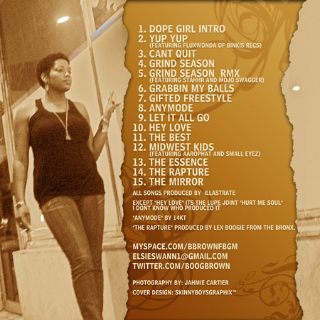 In the world of Hip Hop, Atlanta based Boog Brown spreads her “Dope Girl Magic” like her life depends on it and returns us to the roots of a genre that has literally changed the world. Currently based in Atlanta, Detroit native Brown describes herself as a “lover, fighter and artist.” This is reflected in her personal style, lyrical approach and unique perspective. Though she has been an emcee for roughly 3 years, her writing goes back to the age of 15, allowing her to amass an arsenal of lyrics including two chapbooks of poetry, Swimming Against the Current State of Mind: My Life In Words and Black Tie Fish Fry, and her debut mixtape, the 2007 release entitled Extended Play. Currently, Brown is developing a spring 2010 tour and releasing her latest mixtape, The Grind Season Vol. 1. Following the mixtape, Boog will be teaming up with producer and fellow Detroit native Apollo Brown for the forthcoming summer release of The Brown Study LP on Mello Music Group.