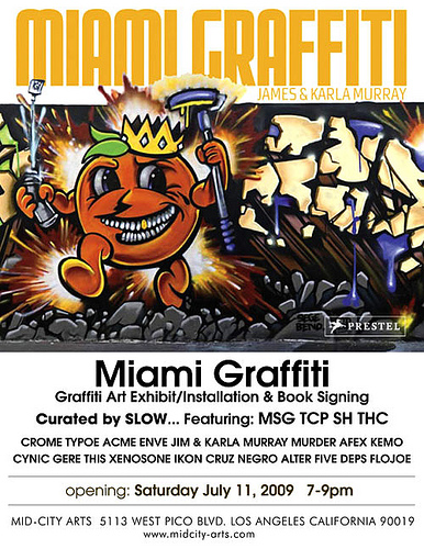Mid City Arts’ “Miami Graffiti” show is a celebration of the release of Jim and Karla Murray’s book – they will be on hand to sign books – and a showcase of some of Florida’s finest street artists from the MSG, TCP, SH and THC crews. Artists from these crews are coming out to Los Angeles and will be displaying their work in the gallery as well as customizing the gallery’s back yard space. Featured artists include Crome, Typoe, Acme, Enve, Murder, Afex, Kemo, Cynic, Gere, Flojoe and others. The show is curated by “Slow”.